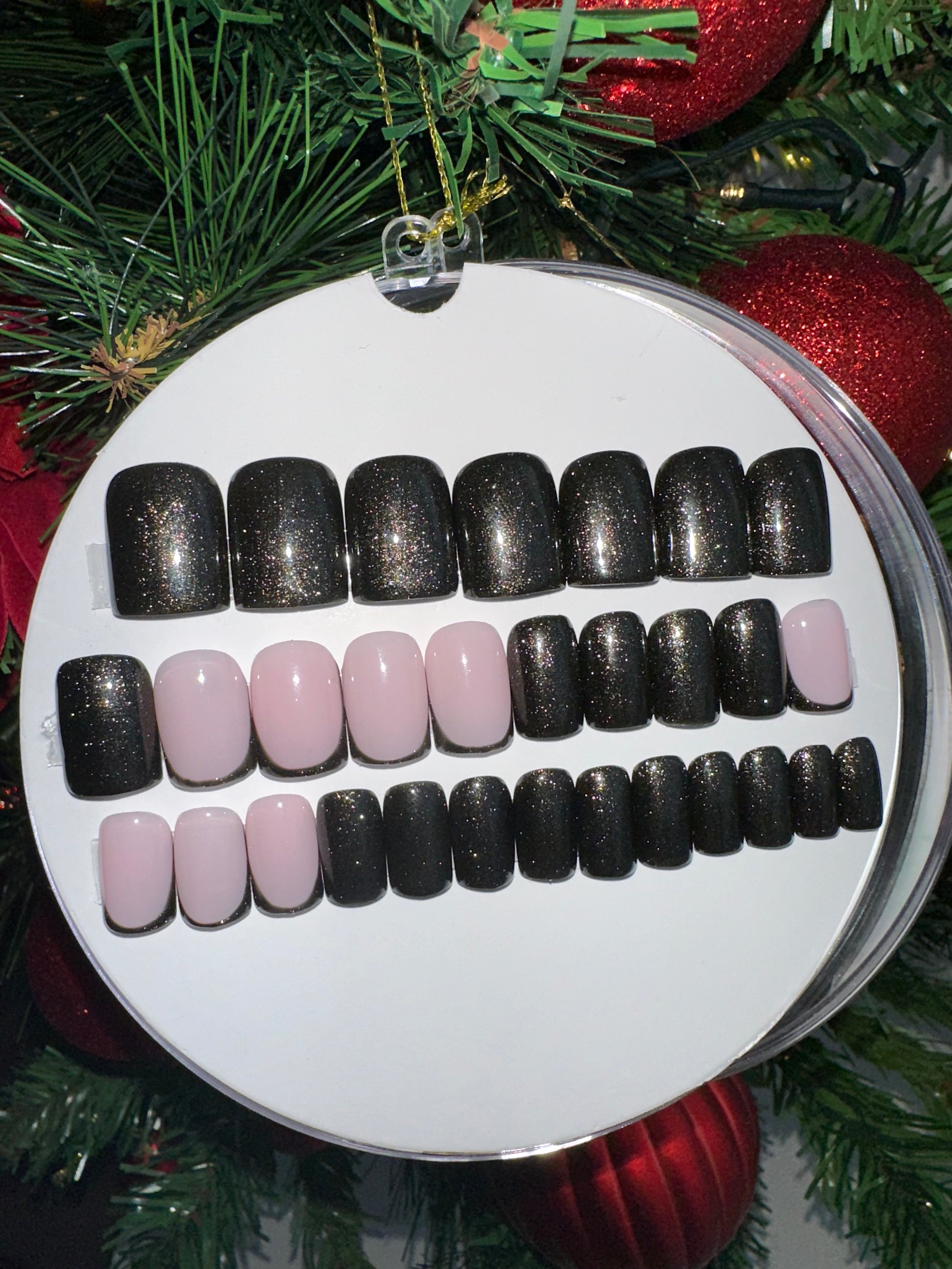 Modèle : capsules unies et french noires à paillettes dorées irisées - Carré XS