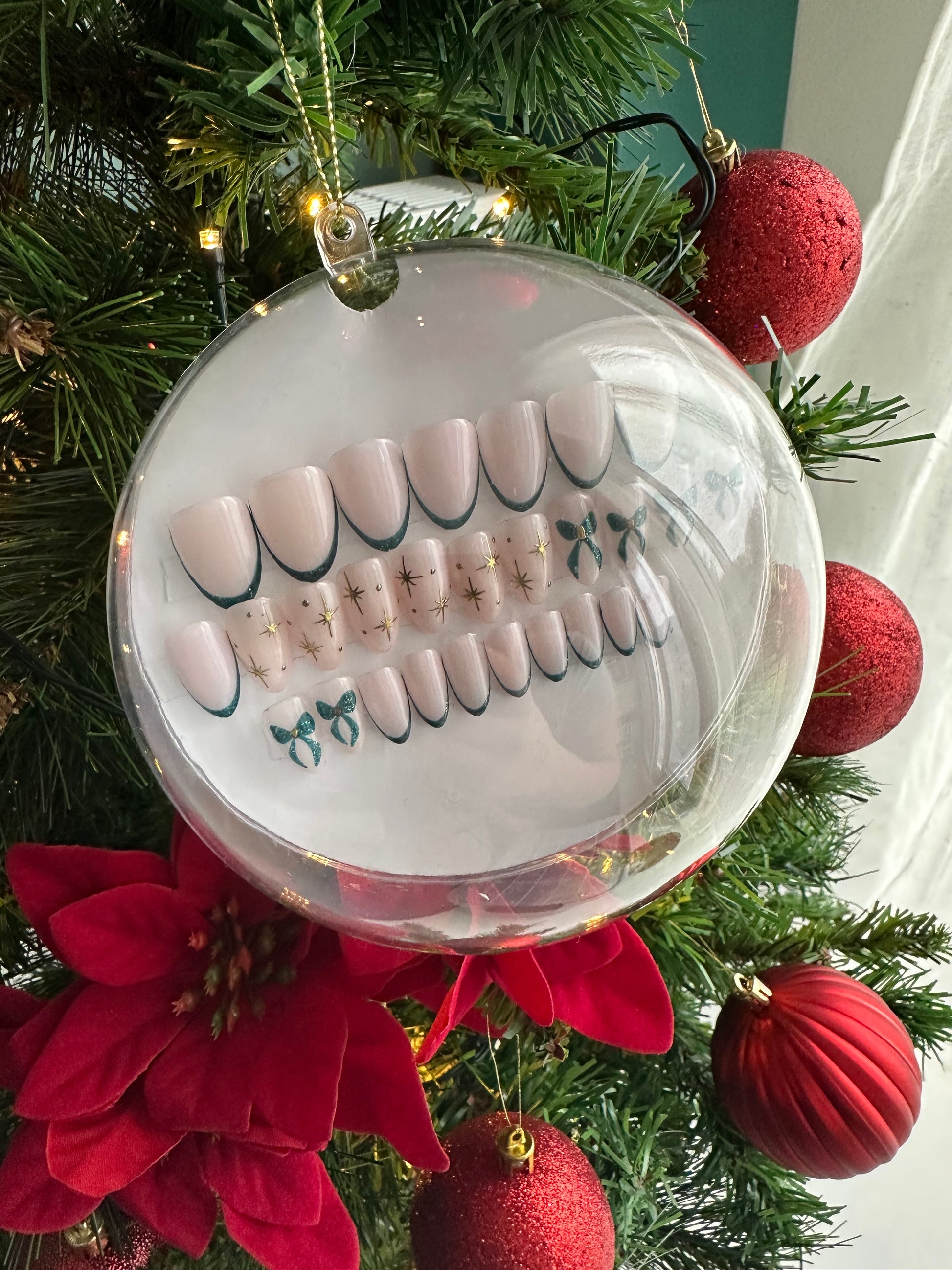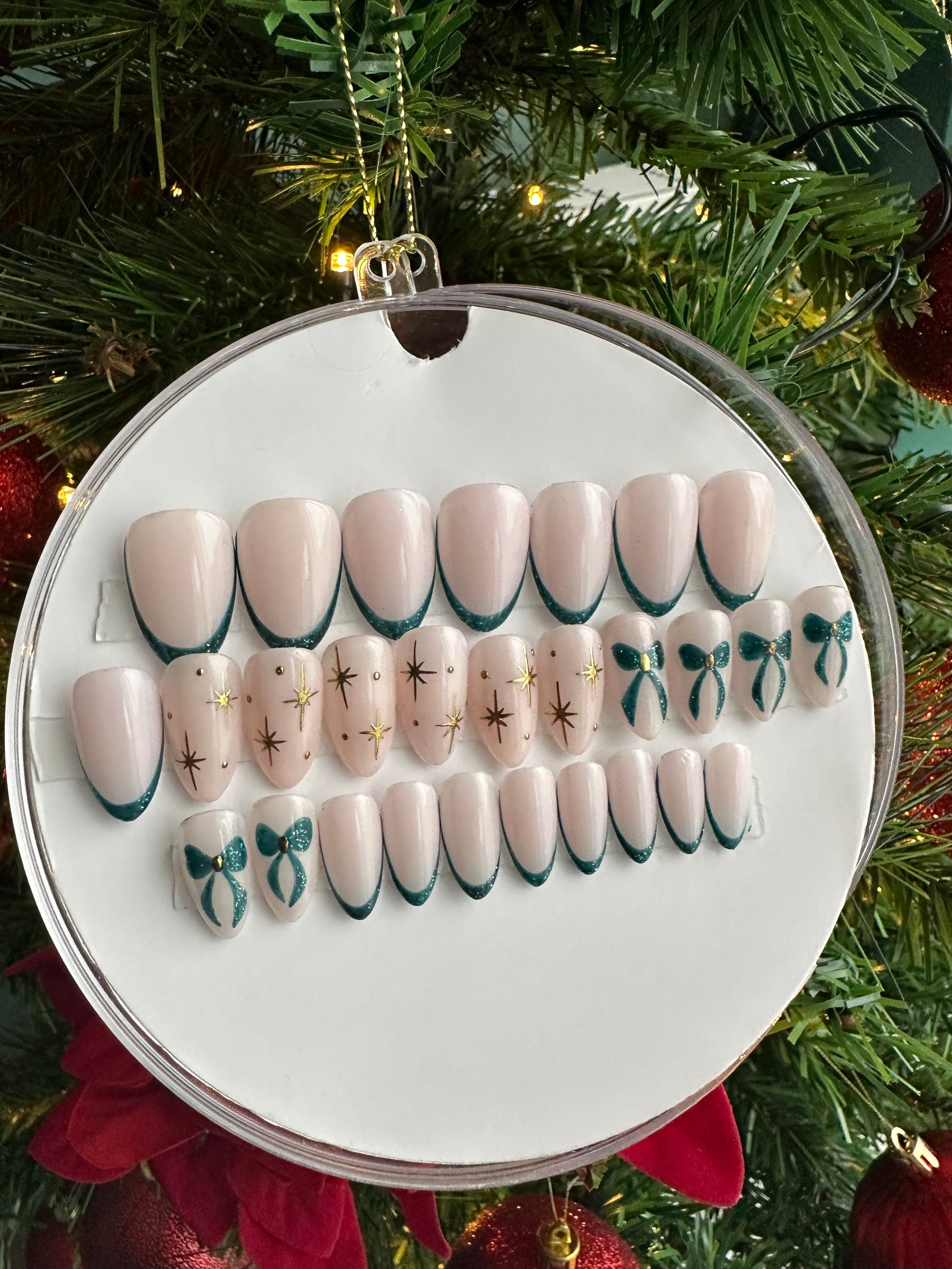 Modèle : capsules ornées de french vertes pailletées, motifs nœuds verts et étoiles dorées - Amande S